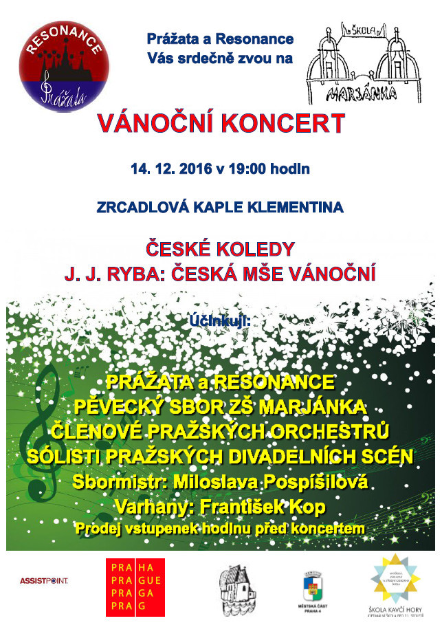 | Repertoár: | PRÁŽATA Pod tím domem (koleda) Pastýři hned do Betléma (koleda) Dítě se nám narodilo (koleda) Pokoj, štěstí, zdraví (koleda) RESONANCE A PŘÁTELÉ Česká mše vánoční (J. J. Ryba) |