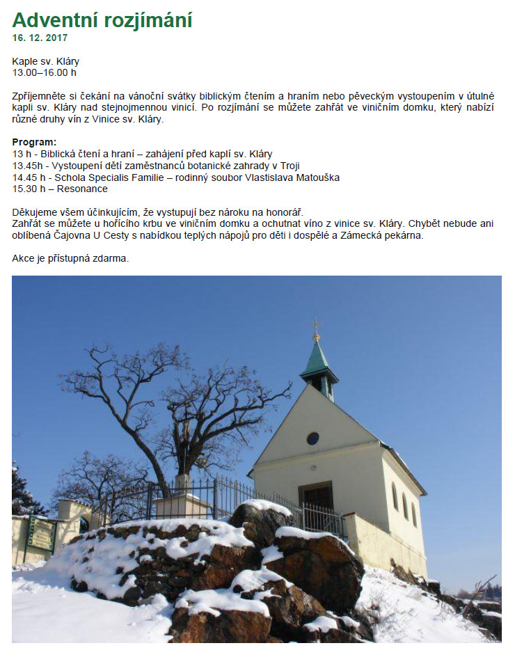 | Místo: | Kaple sv. Kláry, Botanická zahrada Praha |