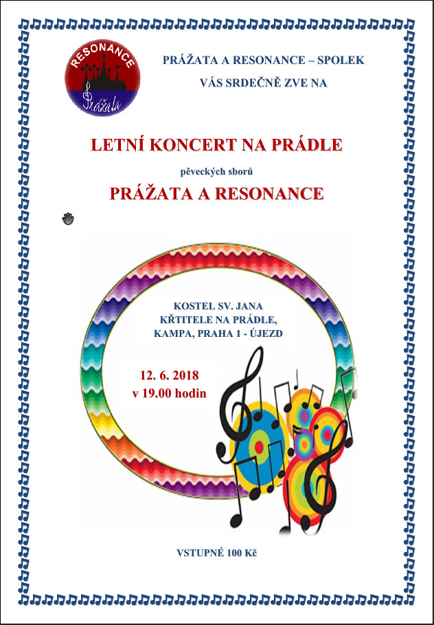 | Repertoár: | RESONANCE Medieval gloria (V. Singh) Tourdion Kadschenu Mila moja (M. Raichl) Šly panenky silnicí (J. Krček) Jede sedlák (J. Krček) PRÁŽATA Hoja hoj (K. Svoboda) Na vlásku (A. Menken) Buchet je spousta (J. Škorpík) A pohádky je konec (O. Soukup) Tři bratři (Svěrák, Uhlíř) Banuwa (libérijská) Ging gang goolie (indonézká) Cups (A. Kendrick) RESONANCE To já, Pane můj (spirituál) We shall overcome (A. Hochedlinger) Siyahamba The lion sleeps tonight (G. D. Weiss) Růže kvetou dál (G. Bécaud) Sestra v akci (M. Shaiman) PRÁŽATA A RESONANCE Ievan Polkka (Loituma) |