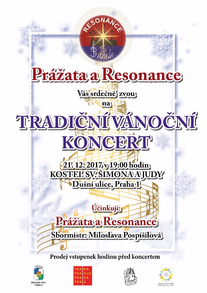 | Repertoár: | RESONANCE Laudate omnes gentes (Žalm) Signore delle cime (G. d. Marzi) Ave Maria (G. Caccini) Alleluia (G. Young) Medieval gloria (V. Singh) To já, Pane můj (spirituál) We shall overcome (A. Hochedlinger) PRÁŽATA Little Snowflake (T. M. Donald) Singa, Yesu singa (spirituál) Mashithi, Amen (africká) Frozen - Ráda sněhuláky stavíš (p. z. pohádek) Hoja hoj (K. Svoboda) Buchet je spousta (J. Škorpík) Pod dubem, za dubem (Uhlíř, Svěrák) Máme doma obludu (M. Krkoška) Půlnoční (J. P. Muchov) RESONANCE Pod kostelíčkem (koleda) Panáček spí (J. Tichota) V jeslích dítě spinká (spirituál) Bim bam (D. Vančura) Ring Christmas Bells (M. Leontovich) Sestra v akci (M. Shaiman) Jesus Born This Day (M. Carey) PRÁŽATA A RESONANCE Ví kdovíci (J. Horner) |