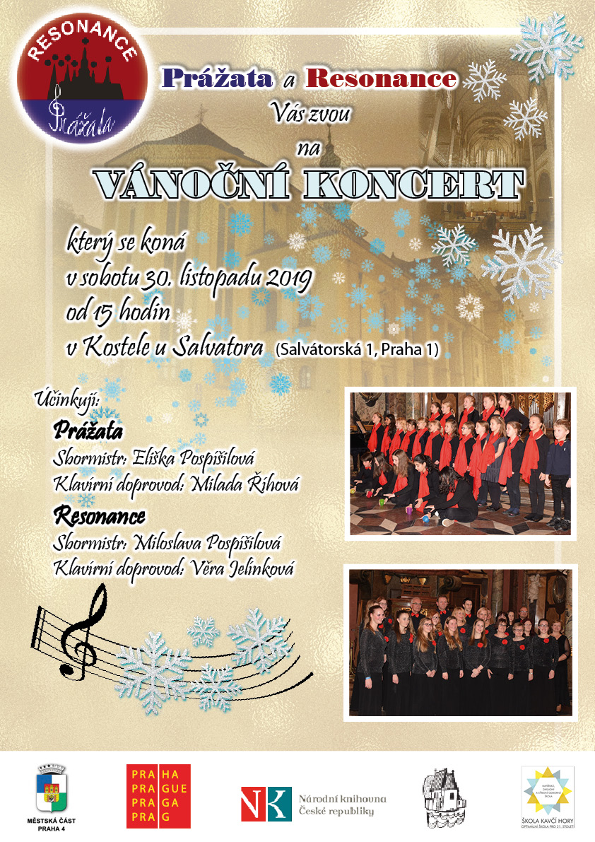 | Repertoár: | RESONANCE Danielis prophetia Aj dnes v Betlémě (K. Dobosiewicz) Parvulus nobis nascitur (anonym) Medieval gloria (V. Singh) Dormi, dormi (italská) Alleluia (Y. Gordon) Maria Mater Dei (T. Arbeau) PRÁŽATA Všude samej sníh (Pokáč) Chválím tě, Země má (Uhlíř, Svěrák) Where Are You Christmas (F. Hill) Kráska a zvíře (Disney) Kočičí ukolébavka (E. Pospíšilová, T. Malčánek) Já cestu znám (Disney) Queen (F. Mercury) Vánoční (Pokáč) RESONANCE Tantum Ergo (O. Soukup) Ding Dong Merrily on High (F. anonym) Thank you for the Christmas Joulupukki verraton (finská) Ring Christmas Bells (M. Leontovich) Oh Happy Day! (M. Arce) Adiemus (P. Starfinger) PRÁŽATA A RESONANCE Srdce nehasnou (R. Krajčo) Půlnoční (J. P. Muchov) |